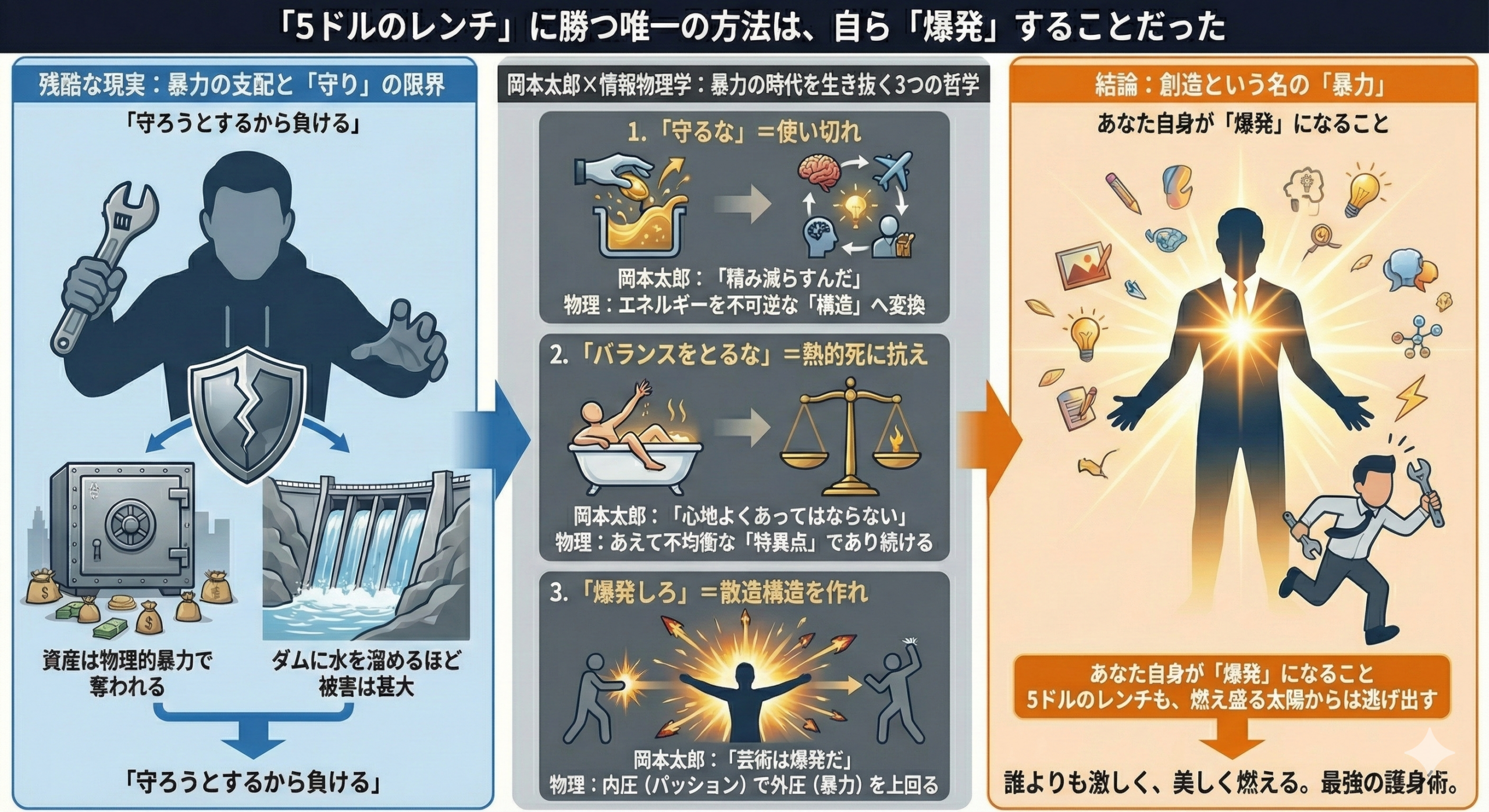 5ドルのレンチを持った強盗も、爆発している花火や、燃え盛る太陽からは逃げ出します。 物理法則と岡本太郎が教えてくれた最強の護身術。 それは、「誰よりも激しく、美しく燃えること」でした。