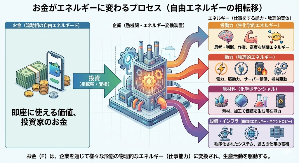 投資とは、手元の流動的な (お金)を、これらの「物理的な仕事能力を持つ実体」へと固定化(相転移)させ、将来の生産活動に備えるプロセスなのです。