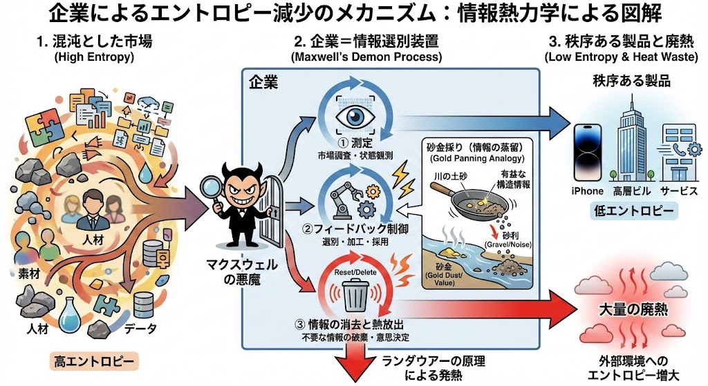 企業活動とは魔法ではありません。 「情報の獲得と選別(悪魔の活動)」によって局所的に製品という『結晶(低エントロピー状態)』を析出させ、その代償として大量の廃熱(計算コストや疲労)を外部環境へ捨てている物理プロセスなのです。