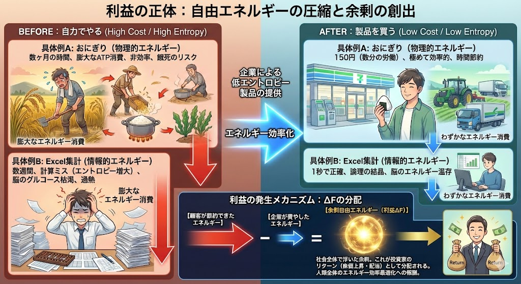 この「顧客が節約できたエネルギー」と「企業が費やしたエネルギー」の差分(マージン)こそが、社会全体で浮いた「余剰自由エネルギー」です。