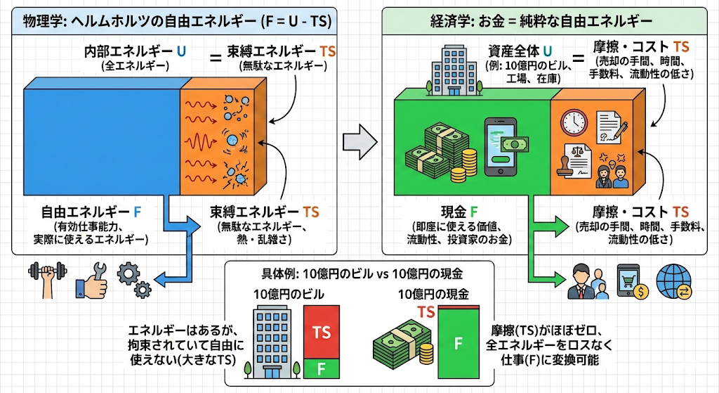 - 工場や不動産( は巨大だが、 も大きい):あなた丸の内に10億円のビルを持っているとします。これは巨大なエネルギー()です。しかし、急に「今すぐ100万円の支払いをせよ」と言われても、ビルの一部を切り取って払うことはできません。ビルを「支払い能力(お金)」に変えるには、買い手を探し、内覧し、登記し、手数料を払うという数ヶ月の時間と莫大な労力()がかかります。つまり、ここには「エネルギーはあるが、拘束されていて自由に使えない」という状態があります。